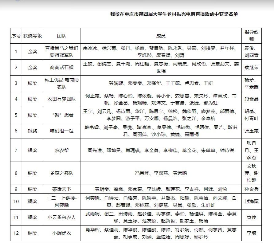 近日,由重庆市教委主办的重庆市第四届大学生乡村振兴电商直播活动评选结果揭晓,文新学子在该项比赛中再创佳绩!