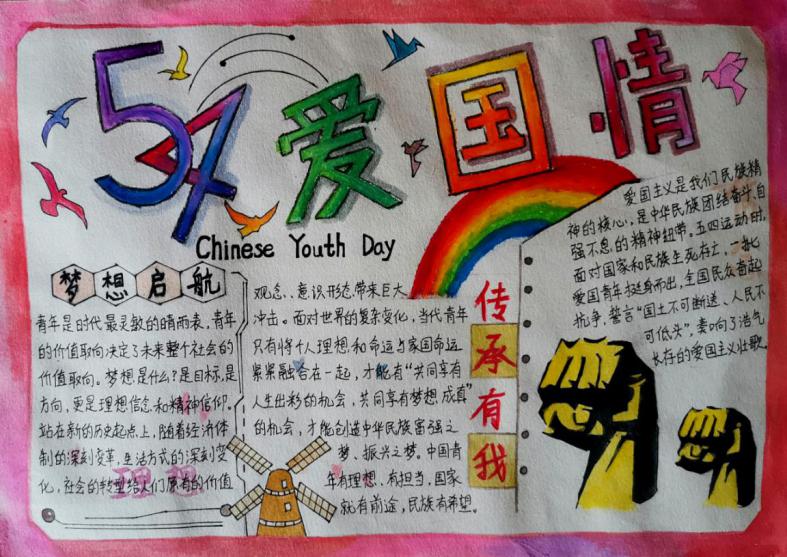 “青年是时代最灵敏的晴雨表。”18级任海燕同学在手抄报第一句写到。中国青年有理想有担当,国家就有前途,民族就有希望。参赛同学将个人理想与家国信念紧密联系,用不同的方式描绘着同一个词,那就是“爱国”。