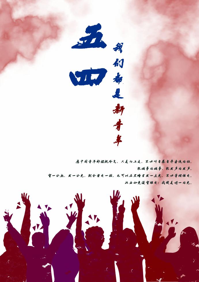 来自17级廖文希同学的海报设计中,欢呼人群的剪影上方有着显著的标语---“我们都是新青年”愿中国青年都能摆脱冷气,不必自暴自弃,能做事的做事,能发声的发声,当代青年要直面困难,有一分热,发一分光,就算在黑暗里,也永远有照亮前行的光。