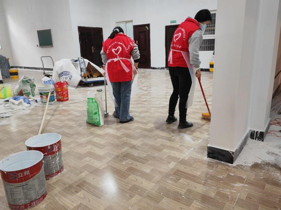 走进教室,基地老师给志愿者们讲解了阳光的成立历史,基地老师说道:“由于三年前洪水侵袭,基地房屋有所损坏,现在装修人员正在维修。”志愿者们听完后便热情投入其中,团结合作清扫地板上的墙灰,打扫洗手池,清理门板,擦拭地砖,为基地装修贡献一份力。活动结束,看着被打扫干净的教室志愿者们的心里成就感满满,并对以后的基地服务充满期待。
