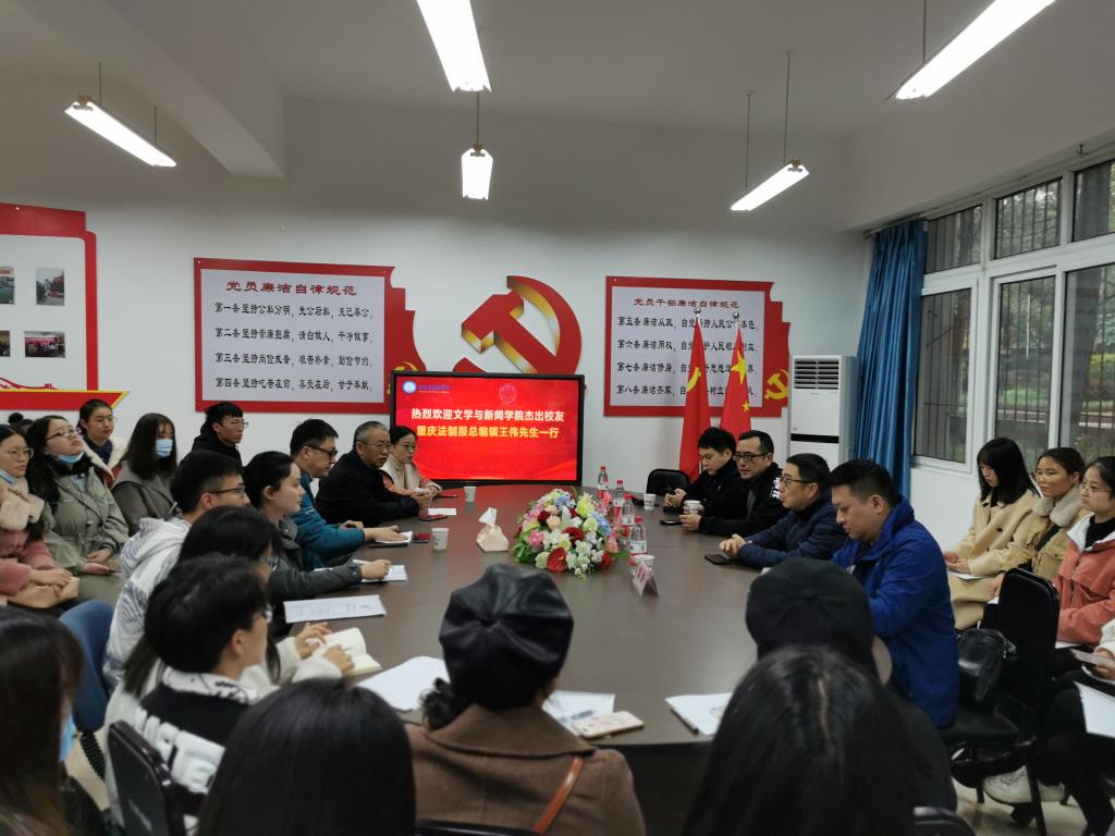据悉,重庆市法制报社总编辑王伟先生系新葡的京集团35222vip1987级中文专业校友,他此次回母校招聘既是支持母校就业工作,也是一次回访母校之行,也是继11月5日,重庆法制报社与学院举行合作共建实践教学基地签约授牌仪式后进一步落实双方产学研合作步伐,探索媒体融合发展新路子的深化落实。
