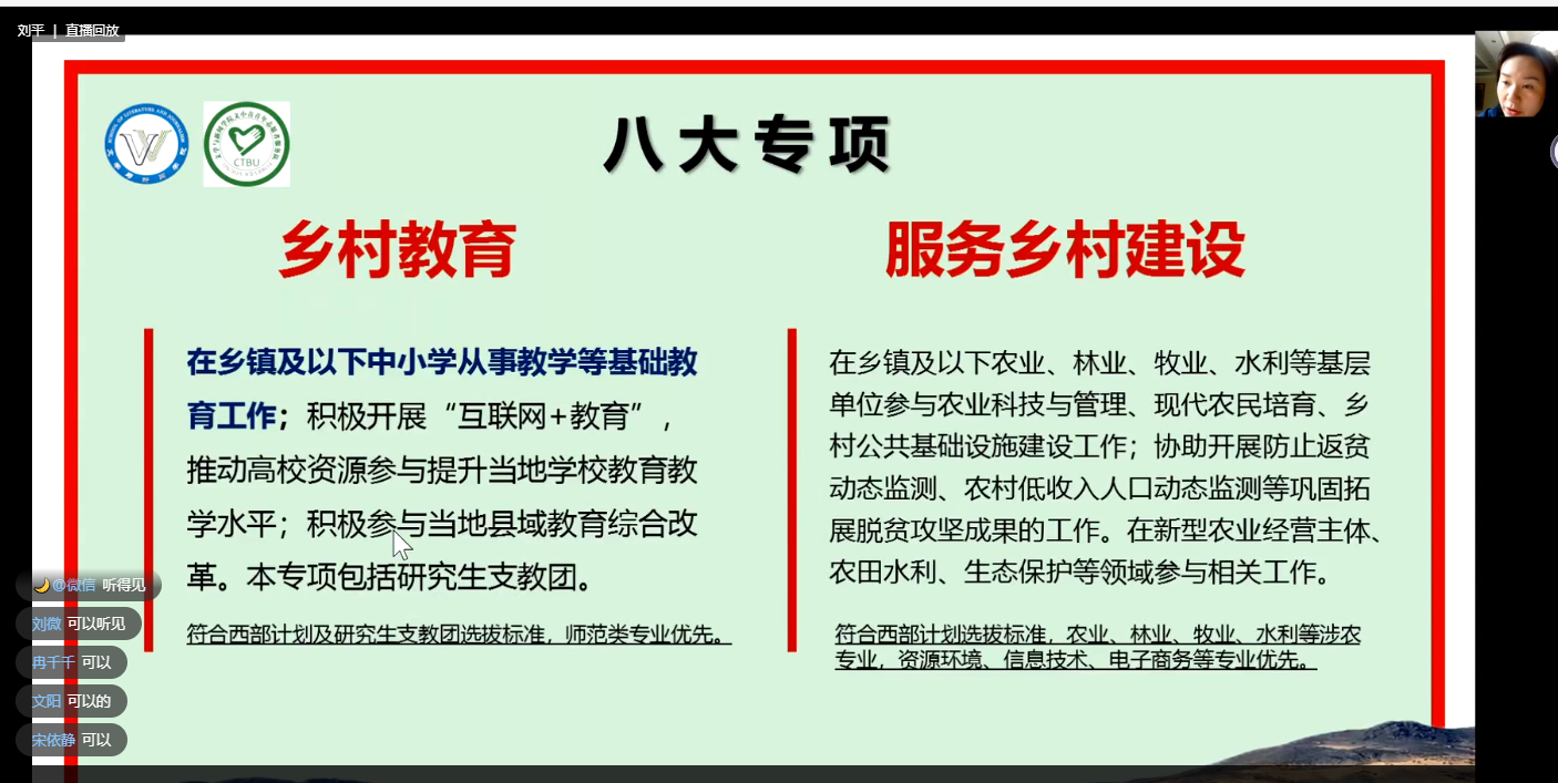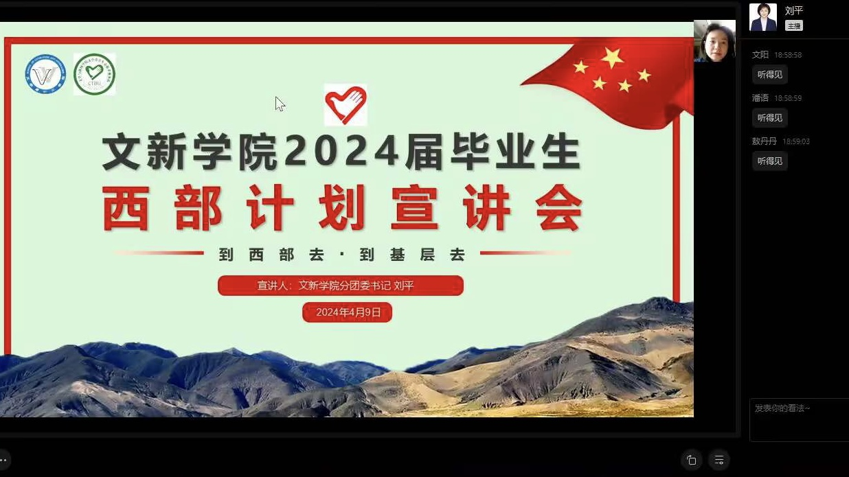 为推进2024年大学生志愿服务西部计划的开展,唱响广大毕业生到西部去,到基层去,到祖国最需要的地方去建功立业的时代旋律。2024年4月9日,重庆工商大学新葡的京集团35222vip大学生志愿服务西部计划宣讲动员会在线上举行,分团委书记刘平为主讲人,文新学院2020级毕业生及青年服务队志愿者代表参会。