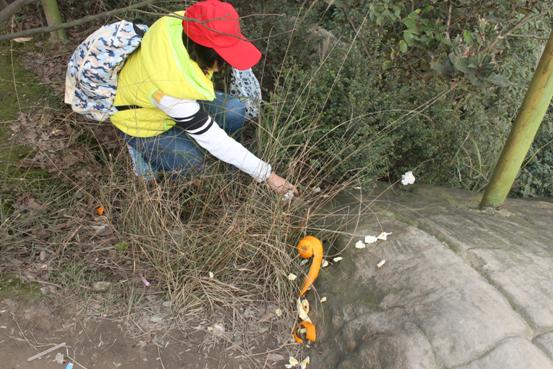 下午一点,志愿者们身着统一服装、手提垃圾袋向龙脊山出发。登山途中,志愿者们仔细清理着沿途的垃圾,还向登山者宣传环保意识,邀请他们加入爱护环境的队伍。志愿者的一举一动深深感染着沿途的登山者,他们就爱护龙脊山环境提出自己的建议:沿途增设垃圾桶。