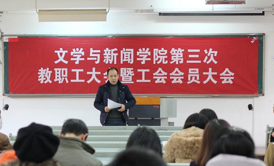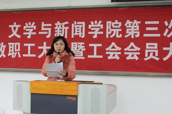 会中,学院工会主席马丽作了学院2014年工会工作报告;学院党政办谭亚娜作了学院2014年行政财务工作报告;学院工会委员王涛作了学院2014年工会财务收支情况的报告。