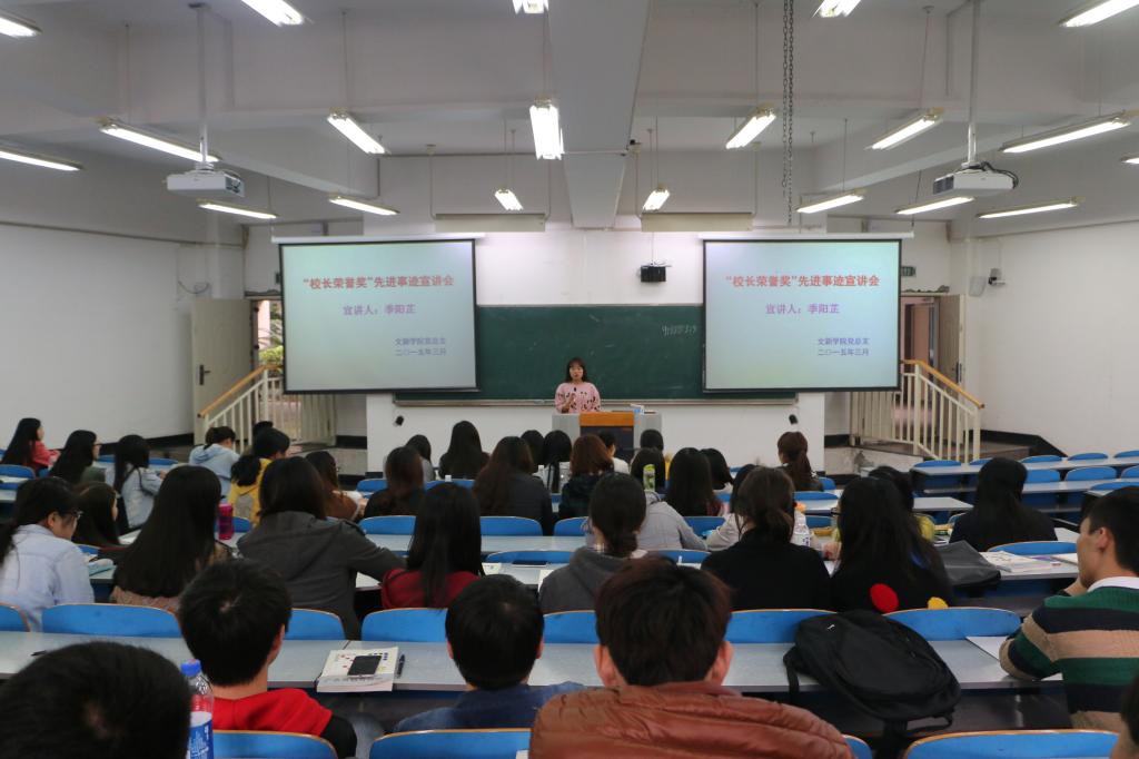 ,新葡的京集团35222vip举办“学习先进经验,感受榜样力量”的主题宣讲会,活动邀请新葡的京集团35222vip首届校长荣誉奖学金获得者2011级广电1班季阳芷同学作主题宣讲。学院党总支副书记李华平、13级辅导员肖婷老师、