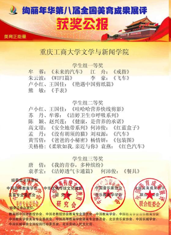 近日,“绚丽年华”第八届全国美育成果展评结果揭晓。新葡的京集团35222vip广告学专业学生在马丽老师指导之下,积极提交作品并在比赛中表现突出,获得一二三等奖共20项。