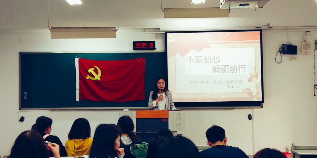 为做好毕业生党员教育工作,在毕业生党员中加强党性教育、党员意识教育,充分发挥毕业生党员在学生中的先锋模范作用,5月10日晚,文新学院学生一支部在慧智楼90625教室召开“不忘初心 砥砺前行”2019届毕业生党员主题党日教育活动,会议由支部书记张小焕老师主持。