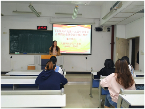 11月1日下午,学生一支部在慧智楼90201教室开展“不忘初心、牢记使命”政治理论学习活动,活动内容是学习习近平总书记在党的十九届四中全会上的重要讲话和全会精神。