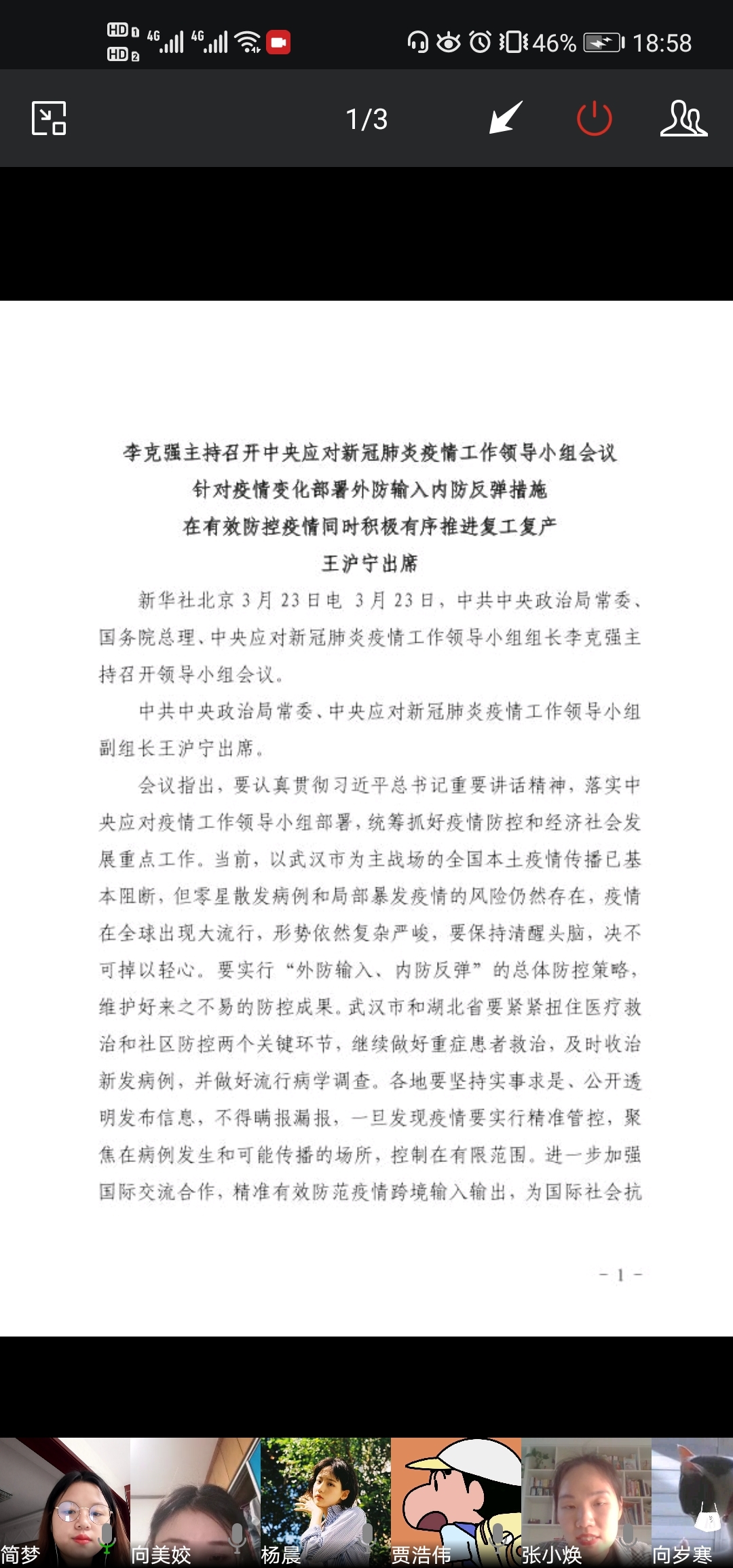 为进一步强化党员意识,4月17日,学生一支部召开“透过新冠肺炎疫情看中国特色社会主义的制度优势”主题党日活动暨政治理论学习会,因为疫情影响,此次活动采取网络形式进行,支部内全体党员参加。