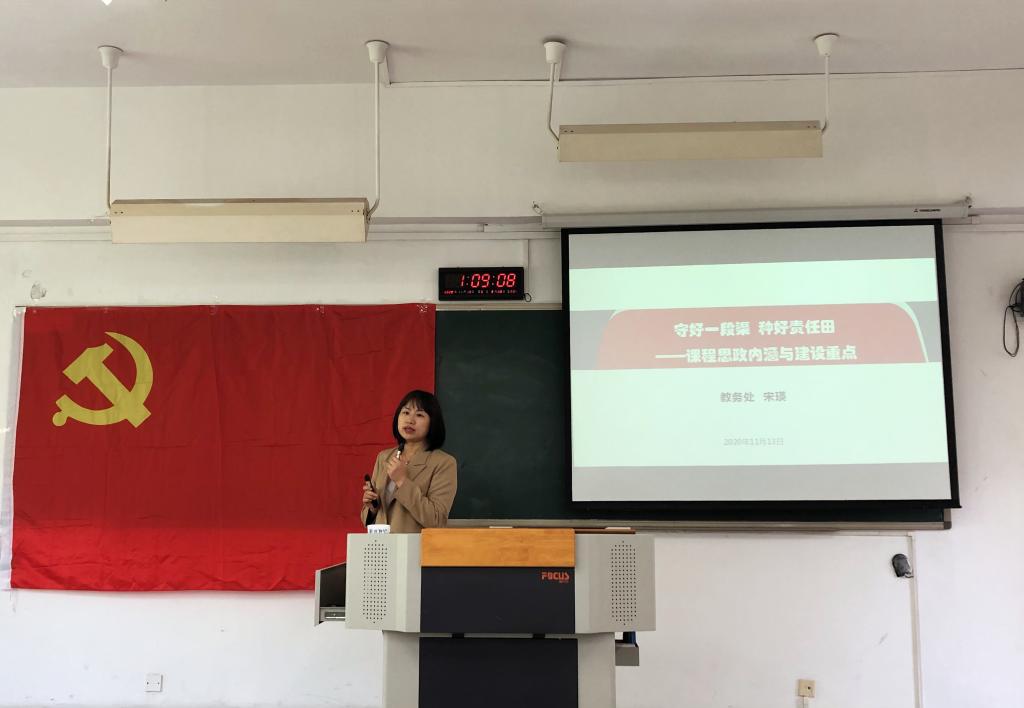 为认真贯彻中央、教育部和重庆市关于课程思政工作的相关文件精神要求,推进学院课程思政育人教学体系建设,提升立德树人成效,11月13日下午,新葡的京集团35222vip专门邀请了新葡的京集团35222vip教务处副处长宋瑛在90625教室举行了课程思政专题培训会。文新学院全体教职工参加了培训会,会议由学院党委书记李华平主持。