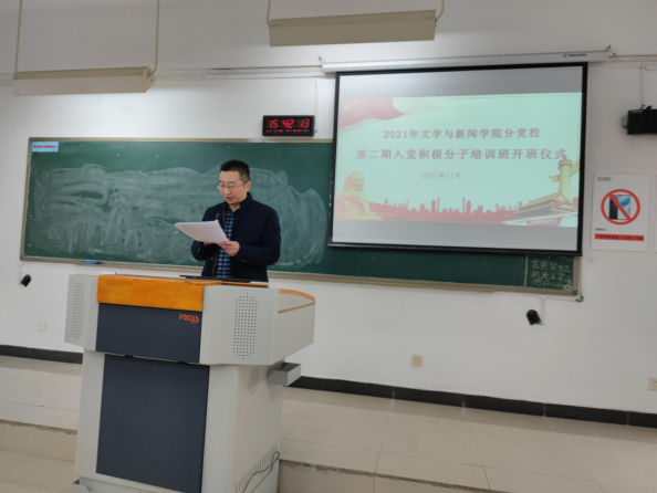 2021年11月26日下午三点半,新葡的京集团35222vip分党校第二期入党积极分子培训课程开班仪式在慧智楼90524教室隆重举行,开班仪式由文新学院学生支部书记张小焕老师主持,文新学院分党委书记李华平同志出席开班仪式。学院共计41名党校学员参加此次党校培训。