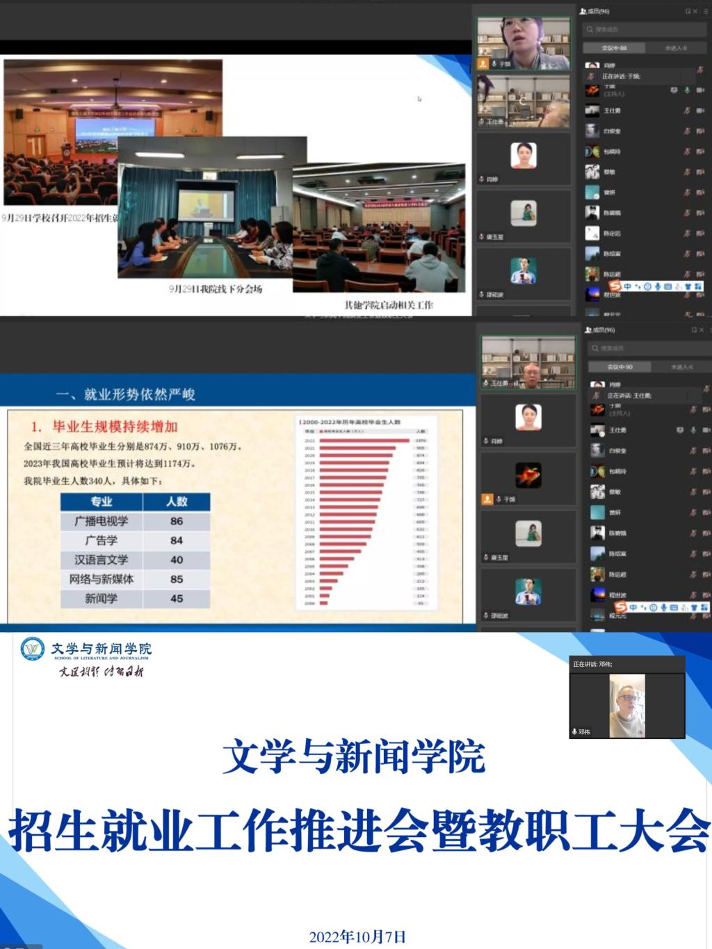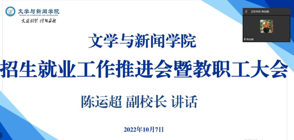 10月7日下午2点30,新葡的京集团35222vip在企业微信工作群召开招生就业工作推进会暨教职工大会。学校党委常委、副校长陈运超出席,学院全体党政领导、全体教职工参加了大会。会议由学院党委书记于频主持。