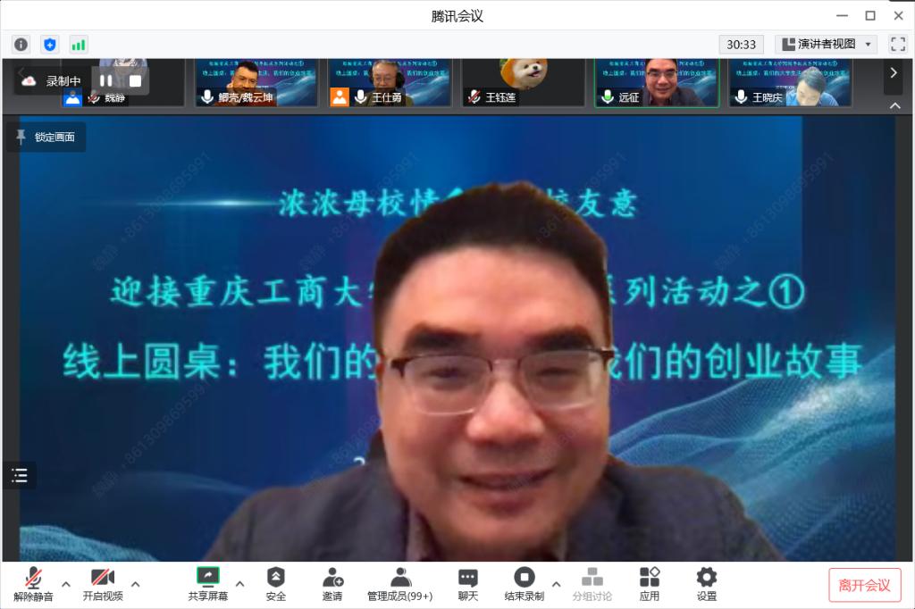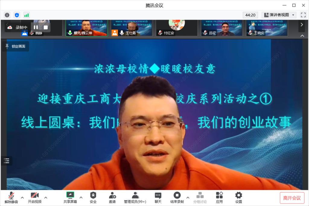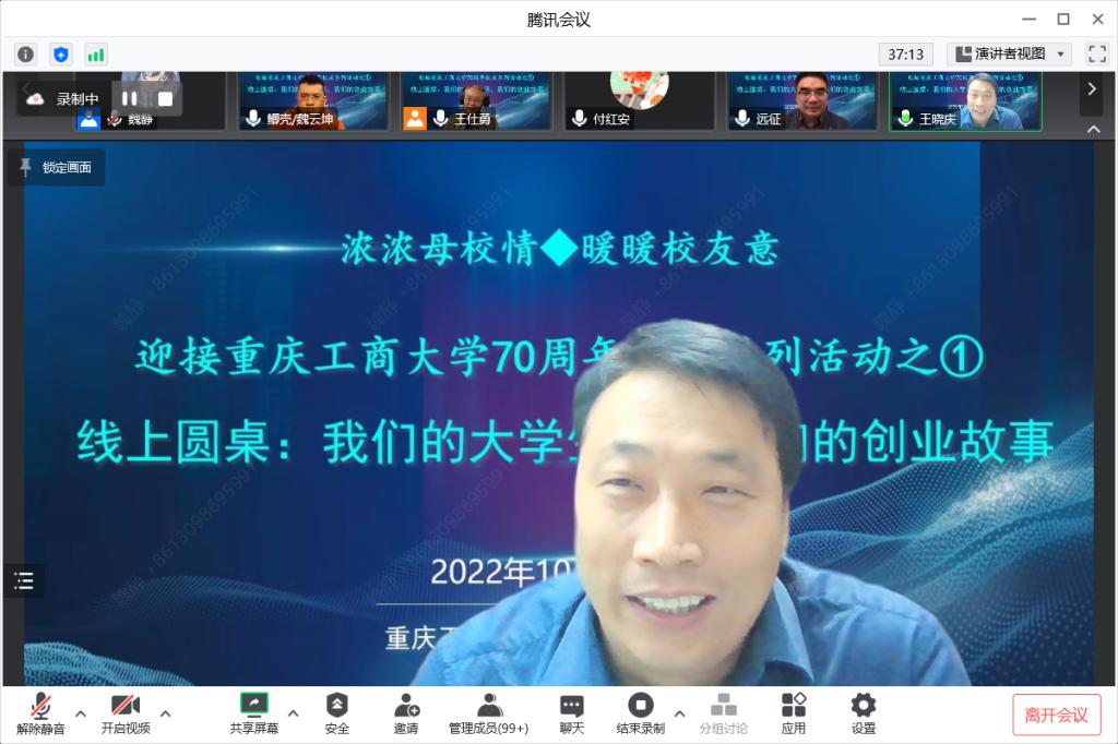 为迎接重庆工商大学70周年校庆,同时为了更好地促进学生学业、职业发展,助力学生实现梦想,促进校友与在校学生的沟通与交流,10月17日19:00,新葡的京集团35222vip举办了以“我们的大学生活,我们的创业故事”为主题的线上圆桌会。94级校友王晓庆(水木数字农业科技集团董事长、民革中央三农委员会委员)、97级校友周远征(民建重庆市委经济委副主任、重庆三峡燃气集团副董事长、征探财经创始人)、97级校友魏云坤(八戒产业服务总裁)三位校友围绕大学生活、创业故事展开交流分享。160多名师生参加了线上圆桌会。会议由院长王仕勇主持。