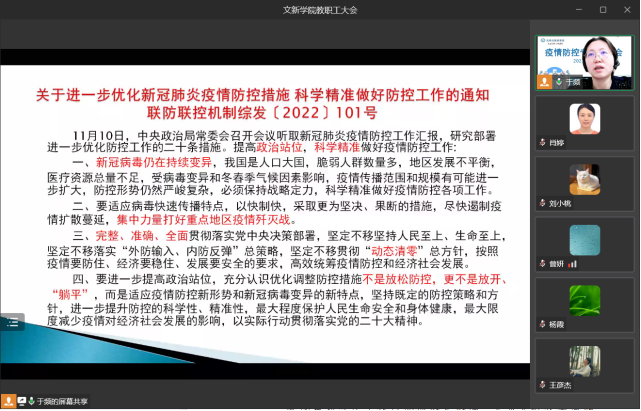 为深入贯彻落实疫情防控工作要求,做好当前疫情防控工作,11月14日晚上,新葡的京集团35222vip以线上会议方式召开疫情防控专题培训会,学院领导班子成员、全体教职工参会。会议由学院党委书记于频主持。