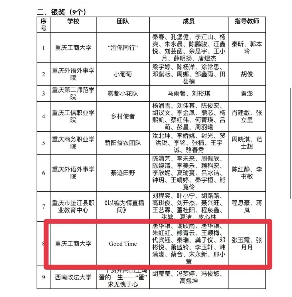 此次活动由重庆市教育委员会主办,重庆大学协办,自2022年9月19日启动以来,吸引了来自重庆市各高校的几百个团队报名参赛。“Good Time”、“儒商优农”两个团队积极学习电商知识,深入了解平台与机制,勇于投身直播实践,主动与社会商家沟通,在学院与专业老师的支持与指导下,经过初赛、复赛、决赛的精彩比拼,最终荣获银奖、铜奖。