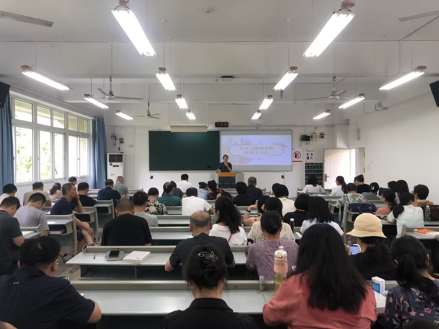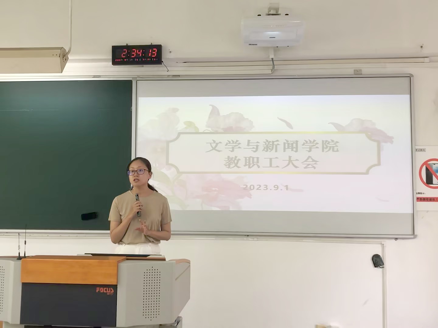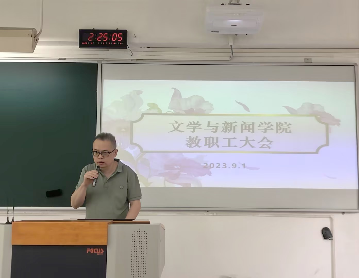 接下来,由各分管领导对本学期相关工作做了布置。程元元副书记通报了学生暑期社会实践情况,并对学生工作进行了安排。邓伟副院长对学院科研工作情况进行通报,对即将开展的研究生招生宣传工作、研究生师生互选工作进行了说明。郑笑眉副院长对学院的本科教学工作进行布置和强调。她对教师们在成绩的录入、教学材料提交、新学期上课时间、教材领取等方面的工作进行了提醒,对各系在课程思政项目和教育改革论文等方面的工作进行了布置。