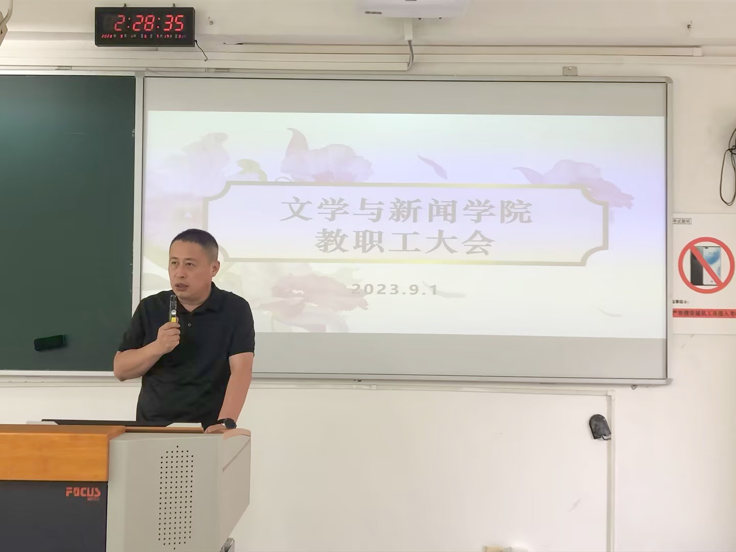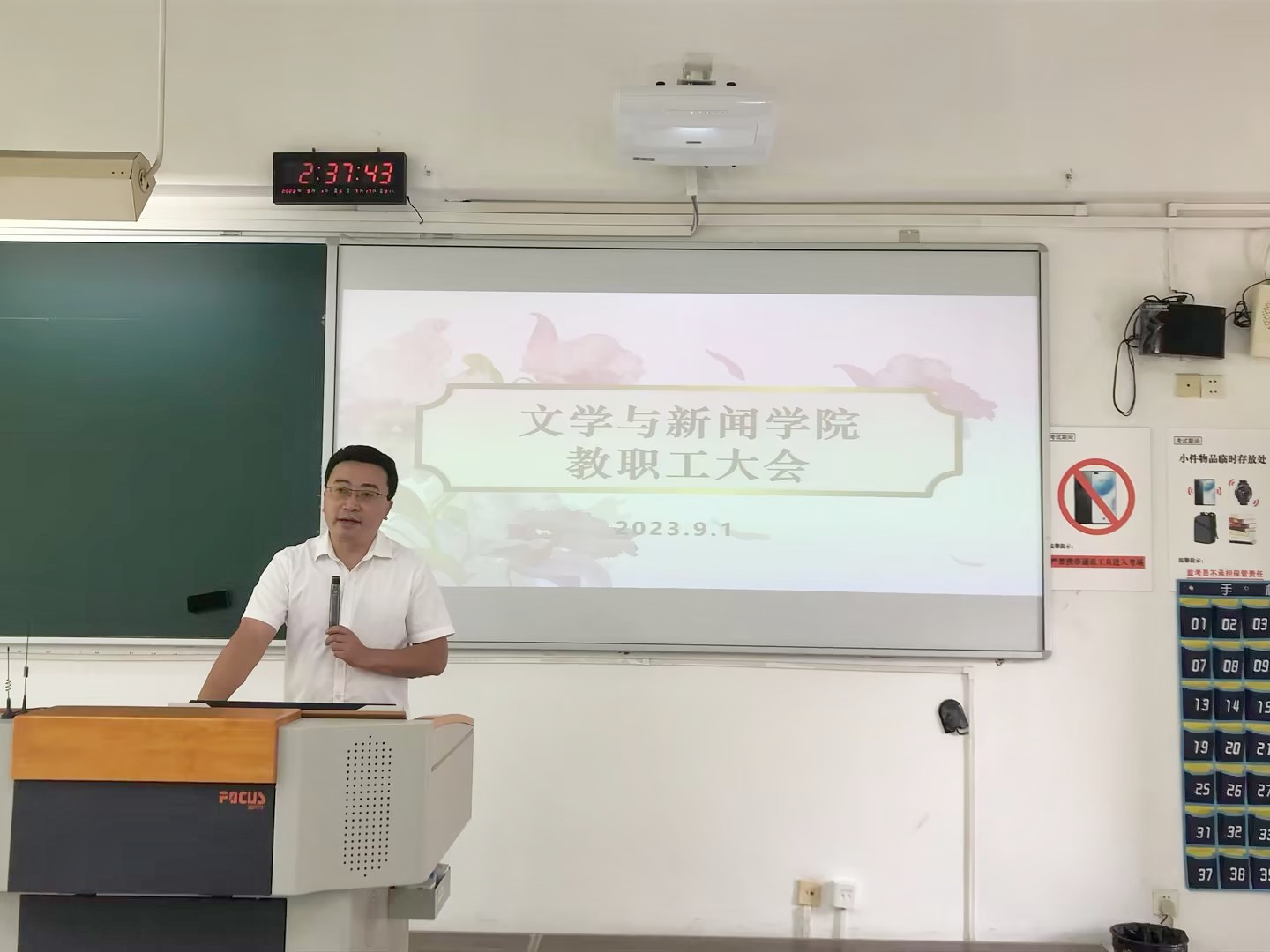 学院党委书记于频代表班子向全体教职工汇报学院主题教育开展情况,通报2023届毕业生就业情况、2024届毕业生暑期实习情况,进行师德师风警示教育,并围绕《习近平在文化传承发展座谈会上的讲话》《南非金砖国家峰会上的系列讲话》《中共中央召开党外人士座谈会》《加强基础研究 实现高水平科技自立自强》等内容领学了9月份教职工政治理论学习。