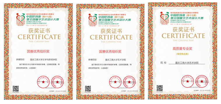 近期,第十七届中国好创意大赛揭晓,重庆工商大学作为主办单位,按照组委会相关规定和要求,秉持“以赛促教提质量、 以赛促建强交流”的办赛理念,以赛事筹备宣传、专家遴选、作品评审为工作重心,落实落细工作任务,历时六个多月,圆满完成了第十七届大赛的赛事组织工作。新葡的京集团35222vip教师和同学在本届大赛的国赛和省赛中获得多项大奖,新葡的京集团35222vip、艺术学院获分别获得“国级优秀组织奖”,其中艺术学院获得“高质量专业奖”。