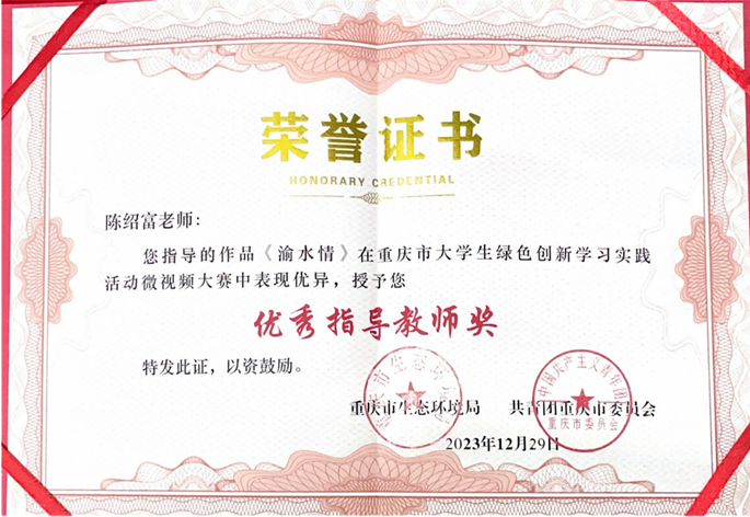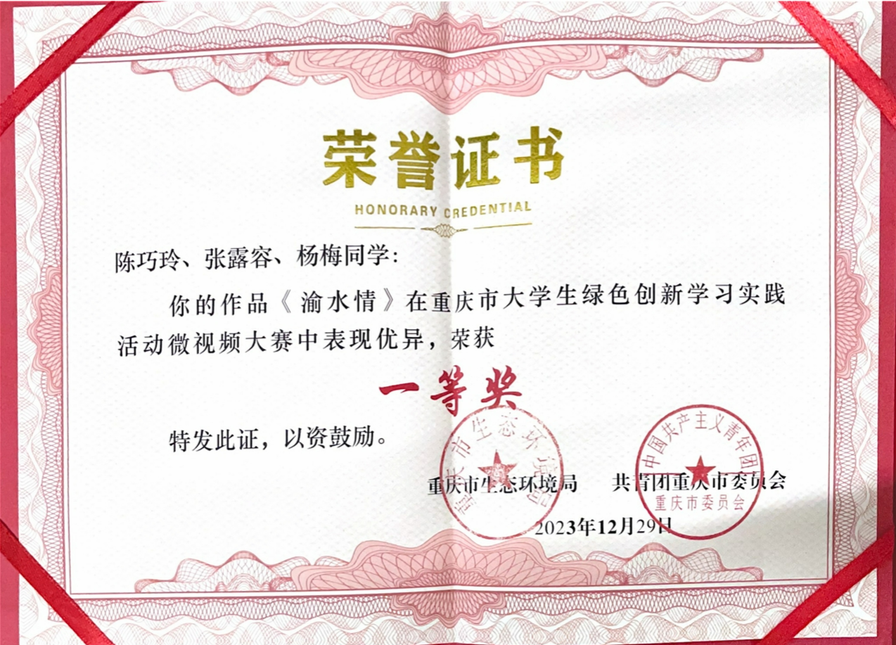 近日,重庆市大学生绿色创新学习实践活动微视频大赛传来喜讯,新葡的京集团35222vip学生陈巧玲、杨梅、张露容在陈绍富老师指导下创作完成的短视频《渝水情》荣获大赛一等奖。