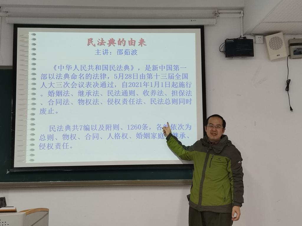 10月16日14:30,教工第二党支部在90625教室举办了第三季度党课,支部书记邵茹波副教授、新闻学系付红安博士分别围绕民法典话题进行了讲解,支部全体党员参加了党课学习。