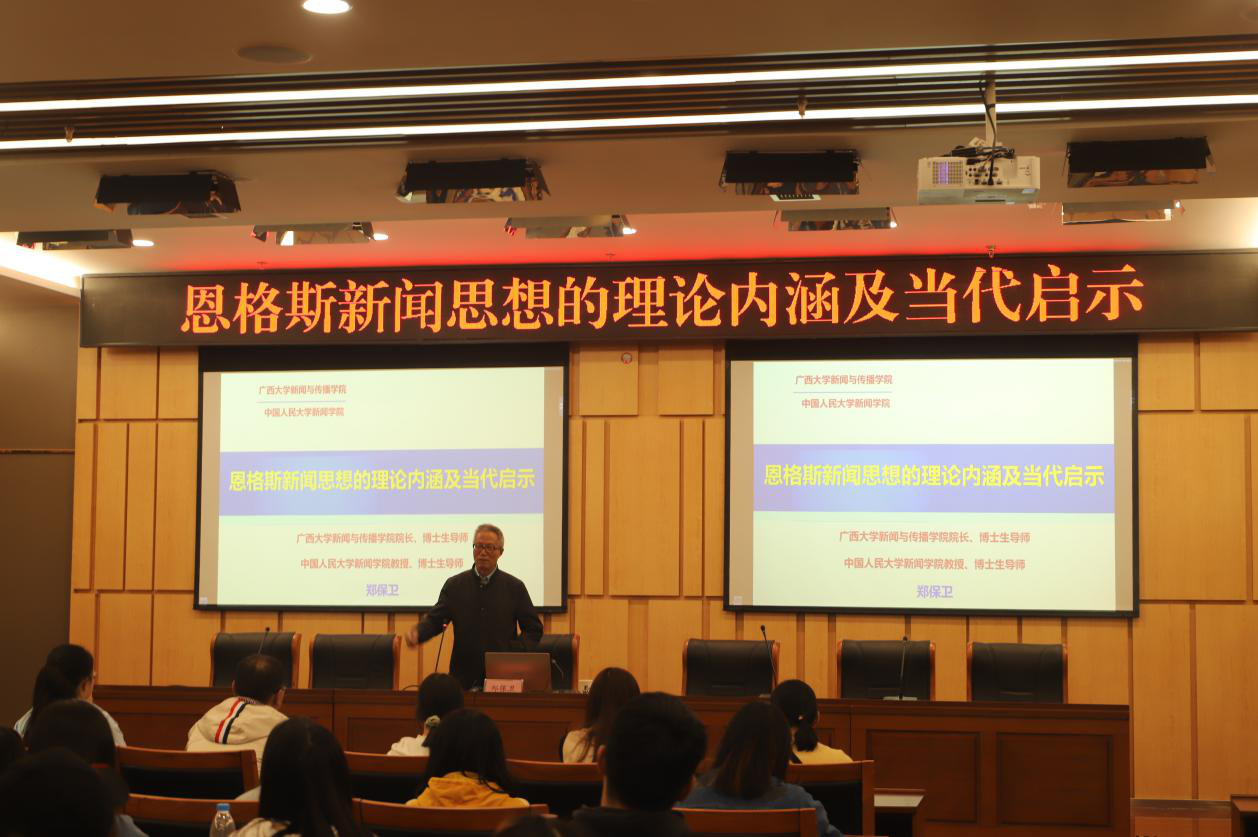 郑保卫教授首先强调了恩格斯在马克思主义新闻观中的重要地位,认为恩格斯是最著名的马克思主义宣传家、无产阶级报刊活动家、卓越的新闻记者和评论家,研究恩格斯新闻思想对我国新闻工作仍具有重要借鉴和指导意义。恩格斯始终把报刊看作为共产党人从事革命运动的“极其值得掌握住的堡垒”,在实践中对无产阶级报刊的性质任务、功能作用、指导方针、工作原则、运行规律进行了许多理论阐述,强调报刊的政治性质、党派属性、群众属性,重视培养新闻工作者的思想政治素养、业务能力等。郑保卫教授希望同学们学习和践行恩格斯的新闻思想,坚持党性与人民相统一,坚持正确的舆论导向,不断增强“脚力、眼力、脑力、笔力”,更好地担负起新形势下宣传思想工作的使命任务。