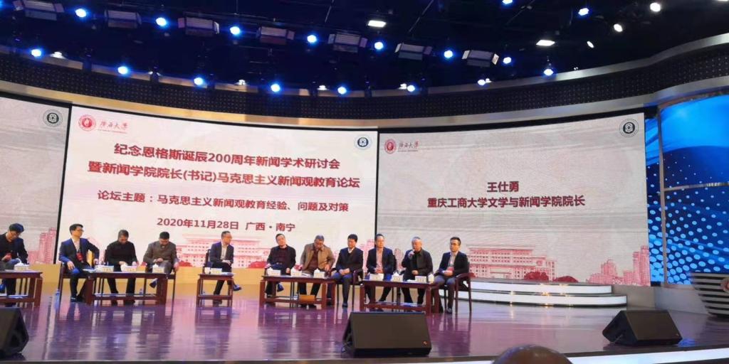 11月28日,“纪念恩格斯诞辰200周年新闻学术研讨会暨新闻学院院长(书记)马克思主义新闻观教育论坛”在广西大学隆重举行。此次研讨会由教育部社会科学委员会语言文学、新闻传播学和艺术学学部,广西大学新闻与传播学院、广西大学马克思主义新闻观研究中心联合中国人民大学、中国传媒大学、复旦大学、清华大学、北京大学、武汉大学、华中科技大学、暨南大学、厦门大学、湖南大学、上海大学、北京外国语大学、陕西师范大学等13所国内著名新闻学院以及马克思主义新闻观研究机构共同主办。新葡的京集团35222vip院长王仕勇教授应邀参加研讨会及论坛,并在论坛上做主题发言。