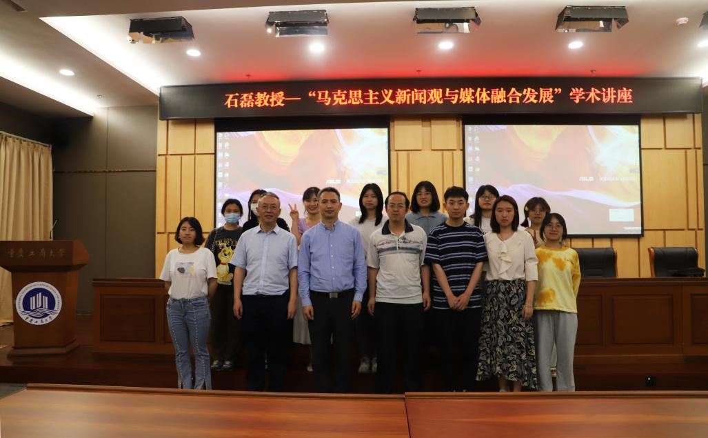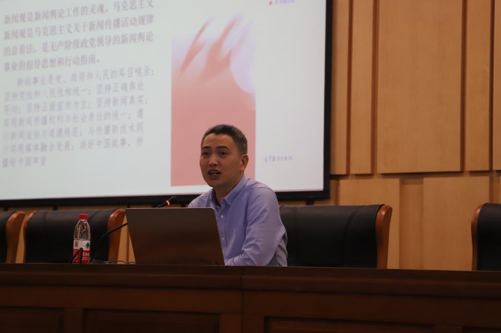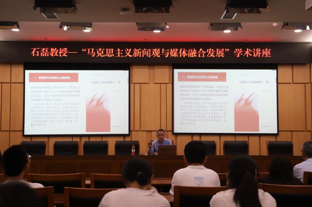 石磊教授谈到,新闻观是新闻舆论工作的灵魂,马克思主义新闻观是无产阶级新闻舆论事业的指导思想和行动指南。他详细介绍了苏联马克思主义新闻观的形成,中国历代领导人对马克思主义新闻观的传承与发展,阐释了政治家办报、全党办报和群众办报的时代意义,新时代下新闻舆论工作应遵循人民至上、党媒姓党、党性与人民性相统一的深刻内涵等。他强调,随着全媒体不断发展,如今出现了全程媒体、全息媒体、全员媒体、全效媒体,信息无处不在、无所不及、无人不用,这导致舆论生态、媒体格局、传播方式发生了巨大变化,新闻媒体工作面临全新的挑战。新时代下,推动媒体深度融合是时代的大趋势,中国新闻业应顺应时代潮流,加大全媒体人才培养力度,健全全媒体传播体系,牢牢占据舆论引导、思想引导、文化传承、服务人民的传播制高点。同时,石教授在讲座中列举了许多著名的学术著作供学院师生学习与探讨,如《马克思主义新闻观十二讲》《马克思恩格斯报刊活动与新闻思想研究》等。