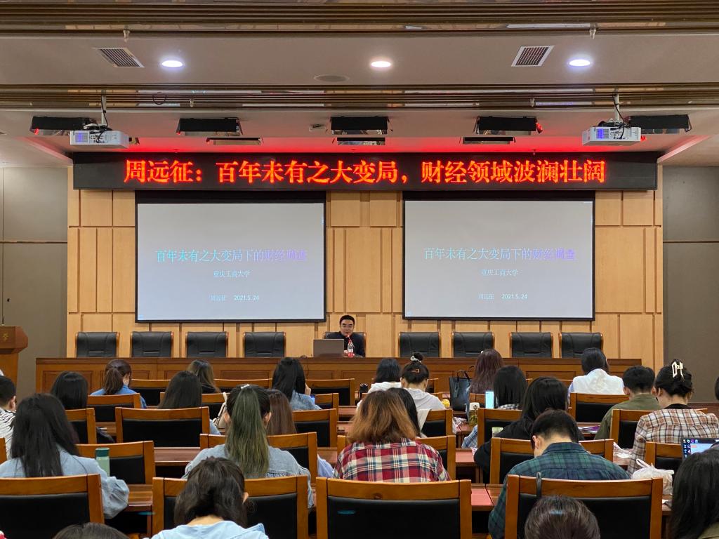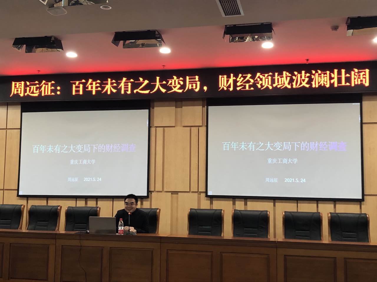 2021年5月24日上午,征探财经创始人、重庆渝北区政协委员、曾任重庆青年报首席记者周远征在重庆工商大学新图书馆会议中心作题为《百年未有之大变局,财经领域波澜壮阔》讲座,讲座由新葡的京集团35222vip邓伟副院长主持。