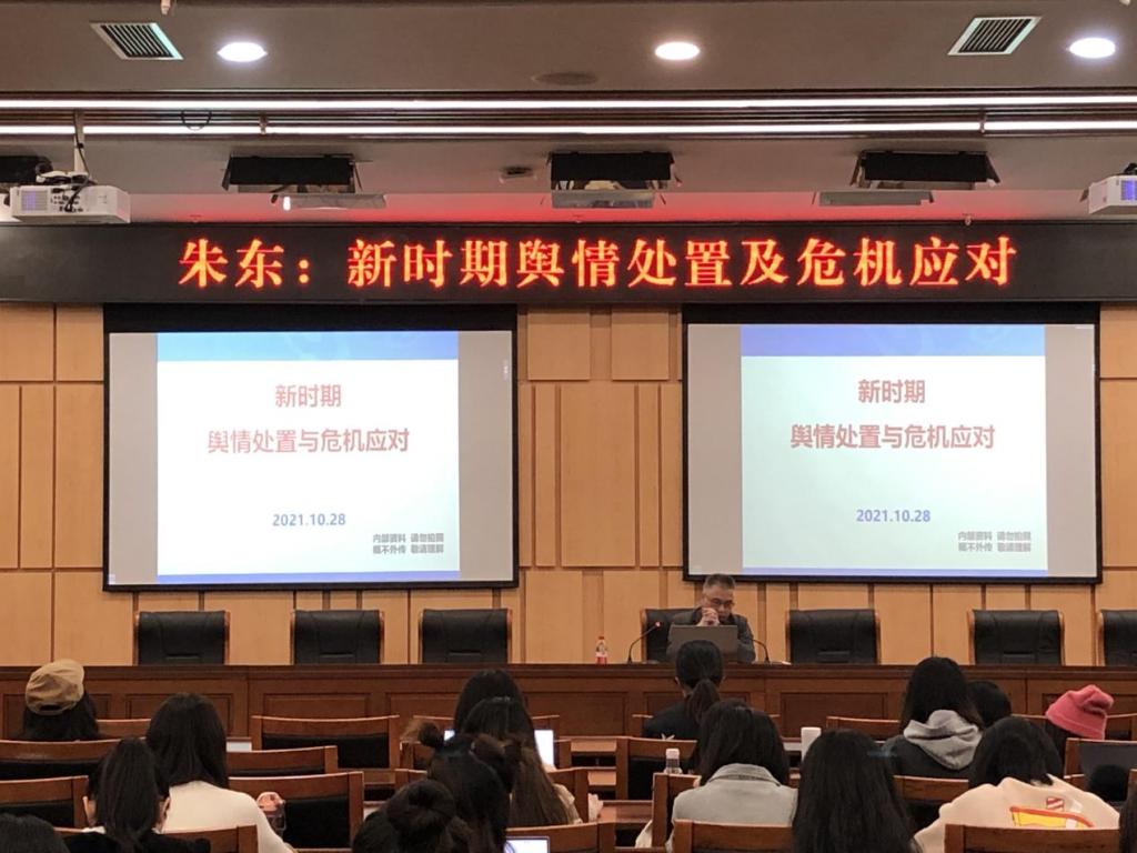 朱东聚焦新时期网络传播路径、危机管理的策略与方法以及互联网时代的媒体应对等课题,紧密结合自身实践经历、实际案例,深入浅出、全面系统的讲解了舆情发展与危机应对的内在规律,以及应对处置策略技巧等方面内容。使与会人员对新媒体背景下舆情处置与危机应对的重要性有了深刻认识,同时对舆情处置与舆论引导的基本原则、方法手段有了进一步了解。部分学生结合自身专业提出了自己的问题,朱东一一解答,和广大师生进行了讨论。