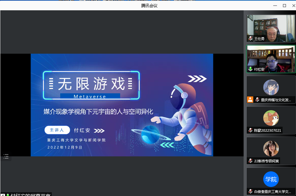 为丰富居家学习生活,拓展学术视野,鼓励学术争鸣,12月9日下午,新葡的京集团35222vip重庆传媒与文化发展研究中心在腾讯会议进行了第五期传媒与文化学术沙龙。本次学术沙龙邀请了付红安博士为大家分享《无线游戏:媒介现象学视角下元宇宙的人与空间异化》。学院青年教师及新闻传播学研究生参加了此次学术沙龙。沙龙由院长王仕勇主持。