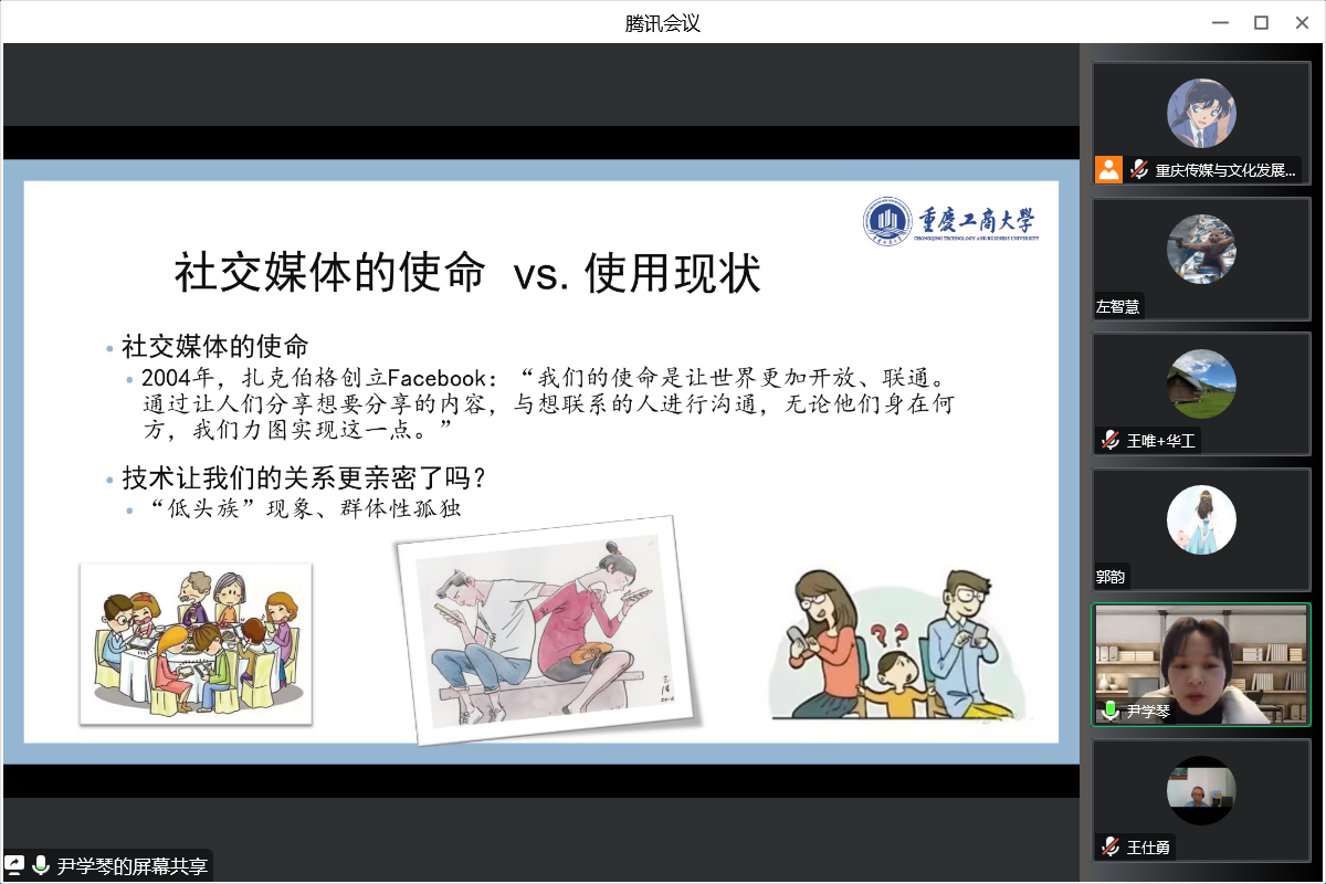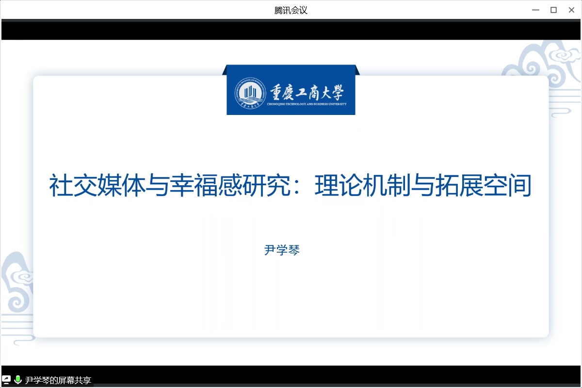 12月30日下午,新葡的京集团35222vip重庆传媒与文化发展研究中心在腾讯会议平台进行了第七期传媒与文化学术沙龙。作为2022年最后一次沙龙活动,本次邀请了尹学琴博士分享《社交媒体与幸福感研究:理论机制与拓展空间》,学院青年教师及新闻传播学研究生参加了此次学术沙龙,沙龙由院长王仕勇主持。