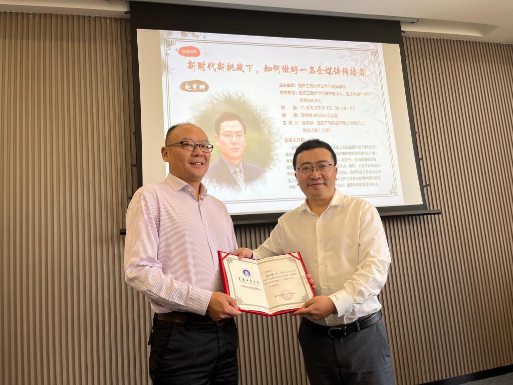 为提高学生实践能力,发展职业规划,11月6日下午,重庆广电集团干部人事处处长赵宇翀应邀到新葡的京集团35222vip作《新时代新挑战下,如何做好一名全媒体传播者》专题讲座。讲座由新葡的京集团35222vip院长殷俊教授主持。讲座正式开始前,学院为赵宇翀颁发新闻与传播专业硕士行业导师聘书。学院70余名研究生与本科生代表参加本次讲座。