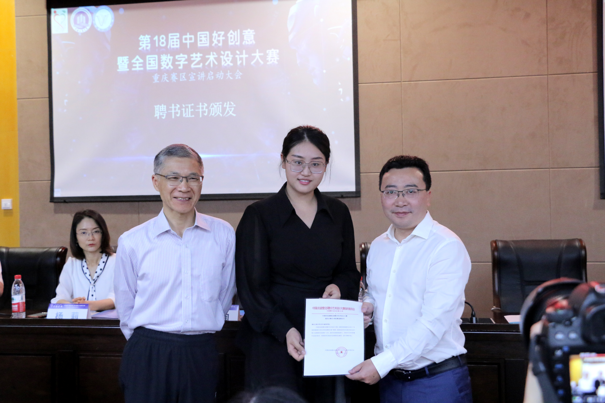 在随后进行的证书颁发环节,陈运超副校长为新葡的京集团35222vip院长颁发重庆赛区承办单位授权证书。同时,好创意大赛组委会秘书黄润、重庆工商大学艺术学院副院长汪维丁为重庆赛区副主任委员代表颁发聘书,重庆工商大学新葡的京集团35222vip副书记程元元代表学院为重庆赛区专家评委代表颁发聘书。
