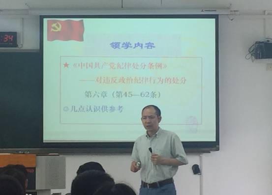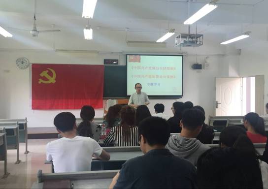学院党总支书记段庸生为参会全体党员师生做了专题党课,主题为:学习贯彻《中国共产党廉洁自律准则》、《中国共产党纪律处分条例》。段书记重点领学了《中国共产党纪律处分条例》中对“违反政治纪律行为的处分”第六章(第45—62条)。段书记首先介绍了第45—62条的相关规定。第45、46、47条,是党员在言论、思想方面的政治纪律。对直接责任者和领导责任者均有纪律处分。第48、49、50条,是党员在组织、参加活动的政治纪律。第51、52条,是党员关于党的团结的政治纪律。第53条,是党员在执行党和国家方针政策方面的政治纪律。第54、55、56条,是党员在民族关系及宗教方面的政治纪律。第57条,是党员在面对组织审查方面的政治纪律。第58条,是党员在对待迷信活动方面的政治纪律。第59、60条,是党员在涉外方面的政治纪律。第61条,是对党员领导干部在责任方面的政治纪律。第62条,是党员在党的规矩方面的政治纪律。