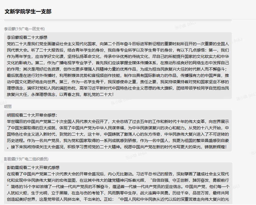 胡丽(支部党员,19广电一班同学):举世瞩目的中国共产党第二十次全国人民代表大会召开了,大会总结了过去五年的工作和新时代十年的伟大变革,向世界展示了中国发展取得的巨大成就,体现了中国共产党为中华人民谋幸福,为中华民族谋复兴的决心和能力。从党的十八大开始,中国特色社会主义进入新时代,到党的二十大,这十年,中国铸就了激荡人心的东方传奇,中华民族伟大复兴进入了不可逆转的历史进程。作为一名共产党员,我为党和国家取得的一系列成就感到骄傲,作为一名中国人,我更为祖国的繁荣昌盛感到自豪。接下来我将持续关注大会盛况,积极学习贯彻党的二十大精神。祝愿中国共产党在新的时代书写更大的荣光,铸就新辉煌!