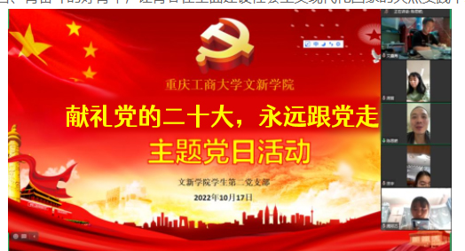 杨喻茚(学生二支部学生党员):“关于党的二十大的‘9个数字’中,令我印象深刻的是,‘第一要务’,即发展是党执政兴国的第一要务。发展一定是政治、经济、文化等领域全方位的发展,而发展的的基础就是保持相对的稳定性。至今,我们的始终以最低的防疫成本,保障着广大人民群众的根本利益。我们超稳定的国内环境、亮眼的外贸数据、相对合理的CPI数据以及近两个月以来吸引的外资说明了这一切。作为新时代的青年党员,听从党的指挥,毫不动摇的坚持我们的防疫政策,是我们的应尽之义。