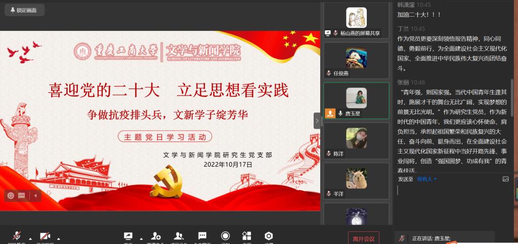 唐玉星(研究生支部书记):党的二十大报告中全面总结了过去五年党的工作和新时代十年的伟大变革,同时描绘了中国特色社会主义的宏伟蓝图。不忘初心,牢记使命,报告总结了中国共产党新时代发展的经验,为我们照亮了前进的路。尤其是在学校遭遇这次疫情防控工作考验的当下,作为党员更应该发挥先锋带头作用,遇到困难,遇到人民群众需要帮助的时候,迎难而上,做学校疫情防控工作的坚强后盾,面对这次考验,我们全体工商党员应拧成一股绳,劲往一处使,万众一心,同舟共济,共克时艰,我们一定能够取得这场疫情防控的全面胜利!