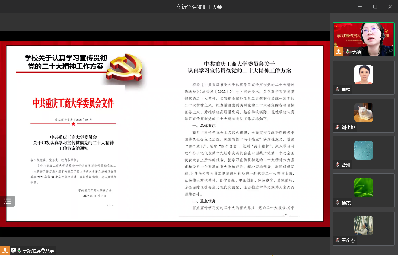 为了深入学习宣传贯彻党的二十大精神,11月15日晚,新葡的京集团35222vip在企业微信召开教职工政治理论学习会,专题学习党的二十大精神,会议由党委书记于频主持。