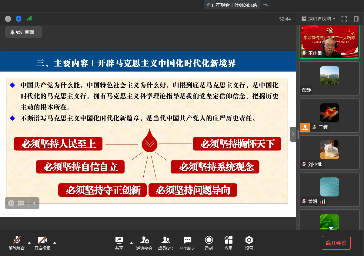 院长王仕勇围绕“大会的主题及意义”“会议成果”“主要内容”三个方面带领全院教职工学习领会党的二十大精神。他强调,要深刻认识过去五年的工作和新时代十年的伟大变革,深入掌握马克思主义中国化时代化的最新成果,准确把握新时代新征程中国共产党的使命任务,进一步增强责任感和使命感,认真贯彻落实新部署、新要求,坚持守正创新,在补短板强弱项上下工夫。最后,他结合学科专业,提出了科研选题思考,希望老师们深刻学习领会党的二十大报告的精髓要义,加强对党治国理政新理念、新思想、新战略的研究阐释,从中国式现代化建设实践经验中挖掘新材料、发现新问题、提炼新观点,推出一批有深度的理论研究成果。