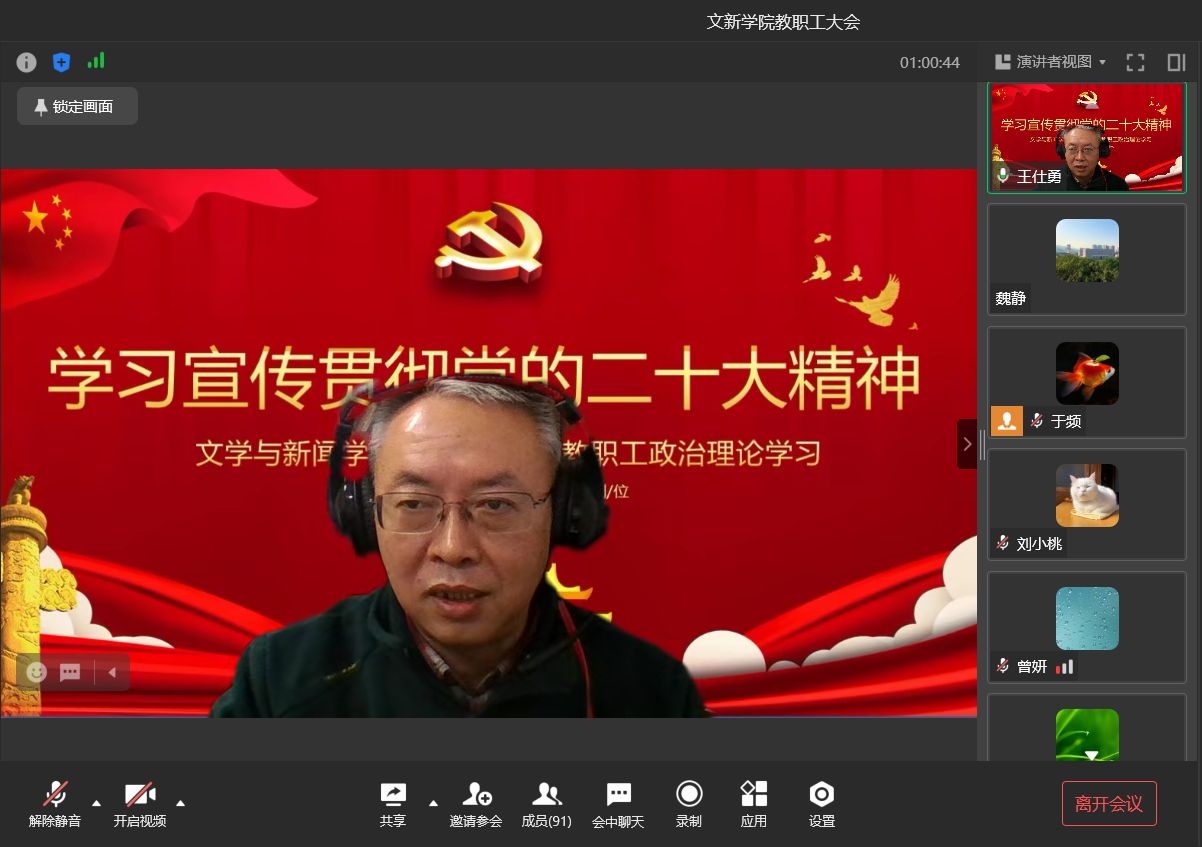 于频在领学时指出,党的二十大的召开意义特别重大:这是在全党全国各族人民迈上全面建设社会主义现代化国家新征程,向第二个百年奋斗目标进军的关键时刻召开的一次十分重要的大会,是一次高举旗帜、凝聚力量、团结奋进的大会。“极不寻常、极不平凡的五年”“三件大事”“马克思主义中国化时代化新境界”“全面建成社会主义现代化强国”“中国式现代化”“五个必由之路”等关键词,充分彰显了以习近平同志为核心的党中央谋划复兴伟业、擘画强国蓝图的历史担当。于频还解读了《中共中央关于认真学习宣传贯彻党的二十大精神的决定》《中共重庆工商大学委员会关于认真学习宣传贯彻党的二十大精神工作方案》,并向全院教职工强调,要坚持把学习宣传贯彻党的二十大精神作为当前和今后一个时期的首要政治任务,深刻领会党的二十大精神实质、丰富内涵、核心要义,切实把学习成果转化为推动学院各项工作高质量发展的强大动力和实际成效。