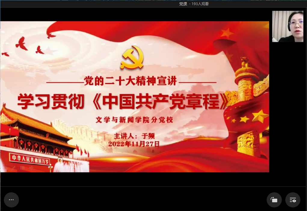 然后,于频书记为同学们作学习贯彻《中国共产党章程(修正案)》党课宣讲。她指出,认真学习党章、严格遵守党章,对强化全党党章意识增强党的创造力、凝聚力、战斗力具有极为重要的作用。学懂弄通党的二十大对党章作出的重要修改,深入领会党章精神,严格遵守党章各项规定,对全体党员来说是基本要求。进而,她从党章的概述、党章的发展历程、党的二十大党章诞生记、党的二十大党章介绍、学习和遵守党章这五个方面进行阐述。于频书记利用小故事,深入浅出地摆出事实、讲明道理,使同学们获益匪浅。就如何认真学习党章、严格遵守党章方面她提出四点建议,一是要坚持结合党史学,二是要坚持带着问题学,三是要坚持缅怀先烈学,四是要坚持对照先进学。她激励大家要以党章为“灯塔”定向领航,提高政治站位,原原本本、逐字逐句学习党章,持续增强学党章、用党章、守党章的思想自觉、政治自觉、行动自觉,争做时代新青年。