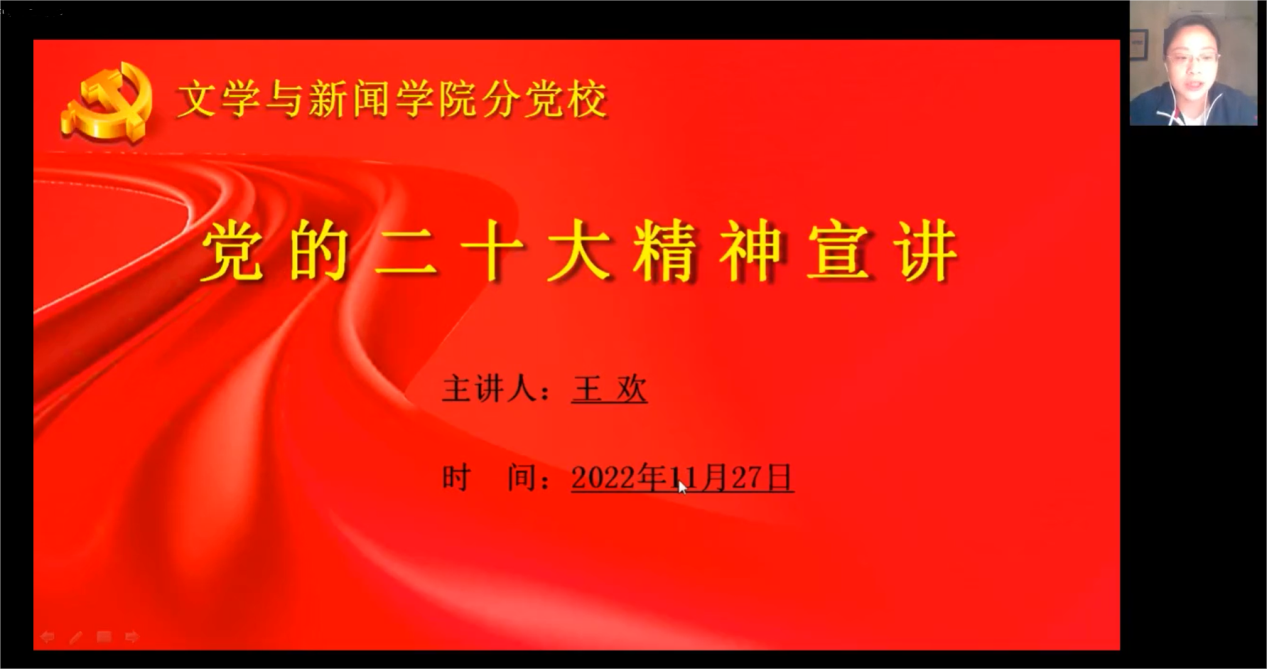 11月27日,为深入学习贯彻党的二十大精神,系统掌握新修改党章所体现的新理念、新思想、新战略,全面贯彻习近平新时代中国特色社会主义思想,新葡的京集团35222vip分党校召开学习党的二十大精神专题党课宣讲。与会人员有新葡的京集团35222vip全体本科学生党员和入党积极分子。专题党课宣讲由新葡的京集团35222vip党委书记于频和组织员王欢主讲。