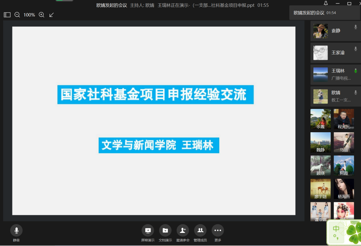 王瑞林老师结合自身成功申报国家社科项目的经验,从选题思路、撰写申报书的框架思路、思路方法和重点难点,以及课题论证阶段的反复修改斟酌等具体环节入手,将具体方法与相关实例相融合,生动详实地介绍分享了自身的科研经验,为广大党员教师后续申报国家社科项目提供了宝贵的经验学习。