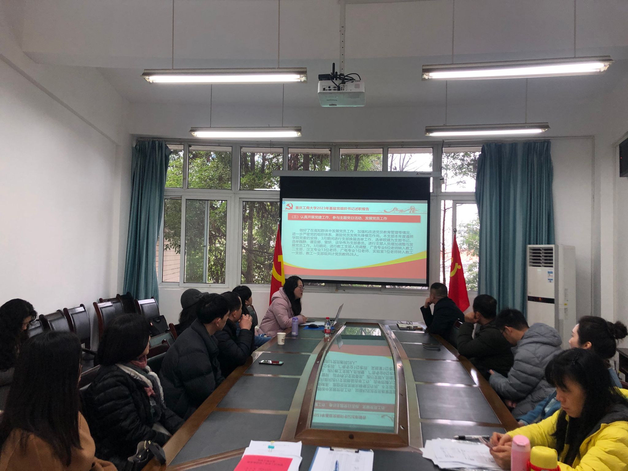 首先由支部书记介绍民主评议党员的相关流程,包括支部书记年度述职、支部委员与党员教师进行批评与自我批评、党员教师对支委会进行评议打分、党员教师对支部全体党员进行测评打分四个环节。支部书记从“履职工作情况”“存在的主要问题”“下一步的工作打算”三个方面展开述职,向支部党员们汇报了2023年度教工一支部主要开展的各项工作与取得的成绩等,重点介绍了支部本年度坚持以线下形式为主,全面完成了“三会一课”与政治理论学习任务,认真开展学习贯彻习近平新时代中国特色社会主义思想主题教育与学习贯彻党的二十大精神,认真开展党建工作、参与主题党日活动等各项环节,以及创建重庆工商大学第三批新时代高校党建双创“样板支部”,支部与党员在日常工作层面发挥带头作用等相关工作动态。同时指出了支委成员领导能力、党员教师自主学习积极性、支部工作方法创新程度等有待进一步提高的现阶段问题,并从进一步深入学习、贯彻实践先进理论,进一步积极主动投入工作,进一步创新工作方法,推进校级样板支部建设等层面,阐述了新一年度的下一步工作打算。