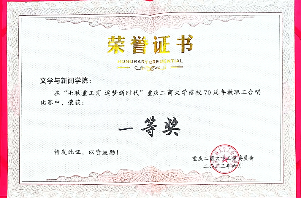 6月2日下午,重庆工商大学“七秩重工商,逐梦新时代”庆祝建校70周年教职工合唱比赛在图书馆隆重举办。新葡的京集团35222vip合唱队积极参加,不负众望荣获一等奖。新葡的京集团35222vip的老师们以乐观开朗的心态,认真的对待此次比赛。新葡的京集团35222vip老师围绕时代主题,在比赛过程中,他们着装整齐歌声嘹亮,以整齐划一的上扬动作和热情饱满的精神状态,精彩演绎了曲目《万疆》,用歌声表达了对党和国家的热爱和美好祝福。最终,新葡的京集团35222vip在20支参赛队伍中脱颖而出,获得本次比赛一等奖。通过此次比赛,不仅展现出了新葡的京集团35222vip教师昂扬向上的斗志和朝气蓬勃的精神风貌,更坚定了大家爱党、爱国、爱校之心。
