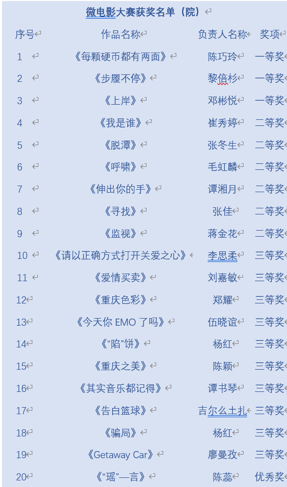 自3月以来,比赛经过专家老师的细致评审和网络投票环节后,获奖名单现已出炉。本次微电影大赛校级获奖作品共12部,院级获奖作品共29部。在此次微电影大赛中,各参赛团队紧扣大赛主题,展现重庆工商大学学子积极向上的精神风貌,以精彩动人的剧情在激烈的评选角逐中脱颖而出,获得了优异的成绩!