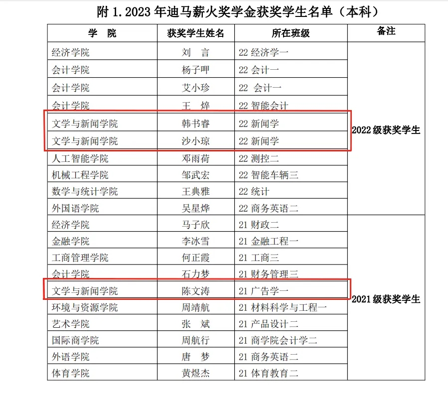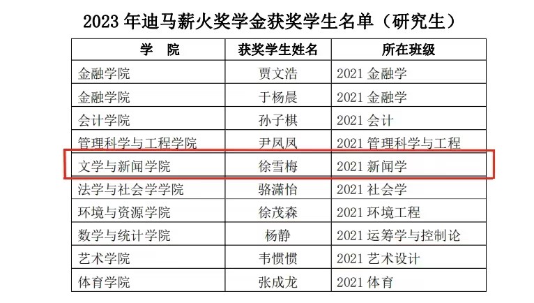 以下是2023年迪马薪火奖学金获奖名单: