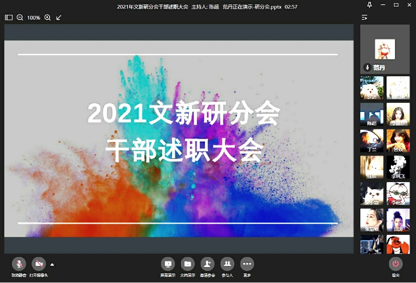 2021年10月8日晚,为进一步提高研分会干部工作能力,确切落实本学期工作计划,在做好疫情防控工作的基础上,新葡的京集团35222vip研分会召开线上2021—2022学年上半学期干部述职评议大会。此次干部述职大会由研分会副主席范丹主持,文新学院研究生支部书记、研究生班主任唐玉星老师和研分会全体成员共同参与倾听和学习。