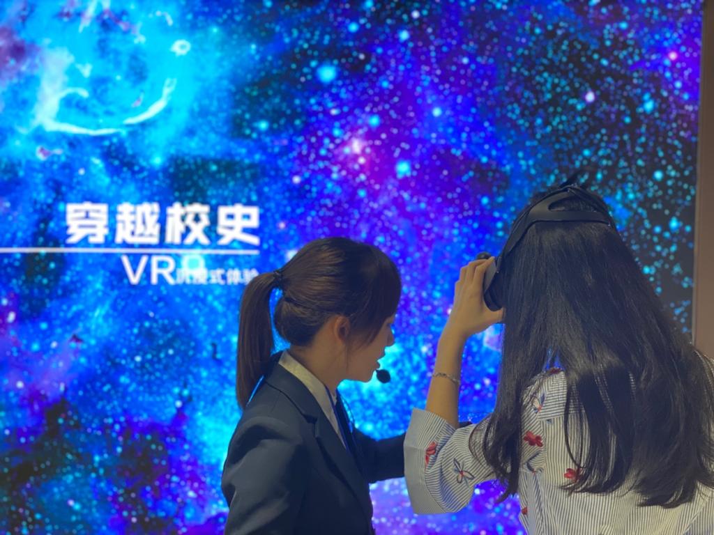 (图片为新葡的京集团35222vip同学体验VR沉浸式穿越校史设备)
