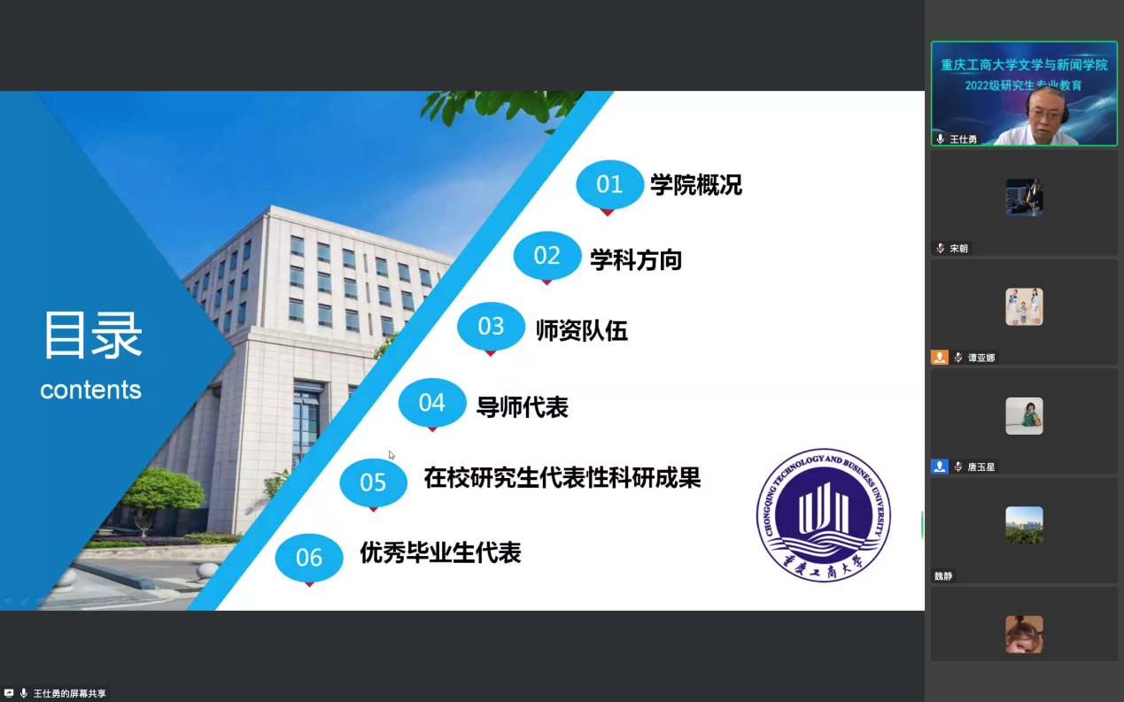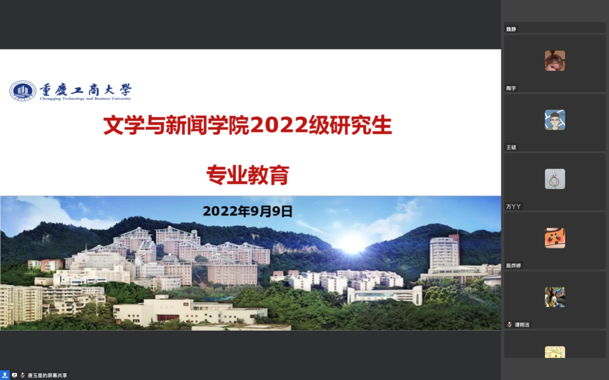 为帮助研究生新生尽快转换角色、融入新环境、增强归属感,9月9日下午2点,新葡的京集团35222vip2022级研究生新生入学教育在线上召开。学院党委书记于频、党委副书记、院长王仕勇、党委副书记程元元、副院长邓伟、副院长郑笑眉、高年级学生代表出席会议,2022级全体研究生新生参加了这次会议。会议由研究生支部书记、班主任唐玉星主持。